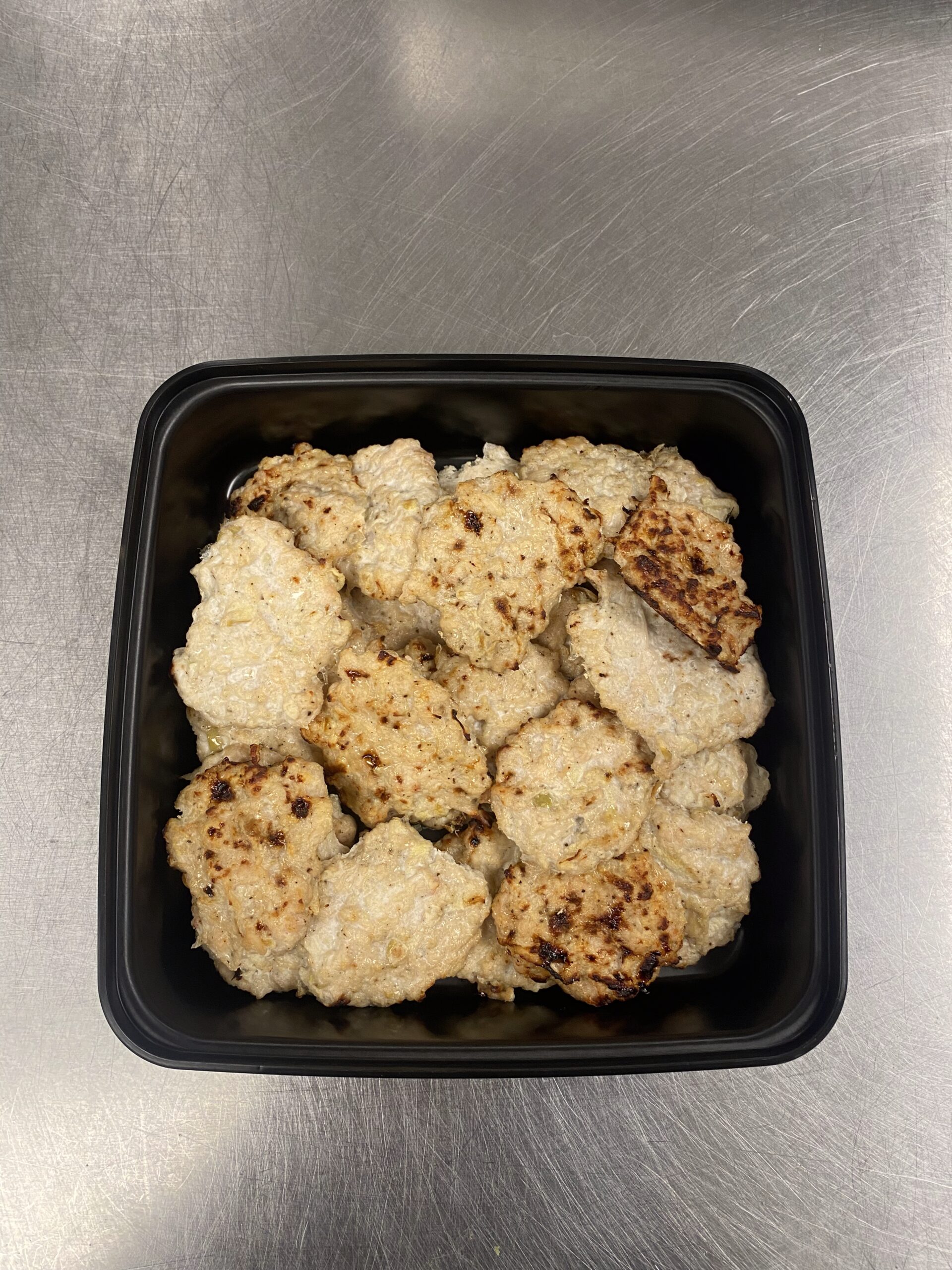 Ground chicken breast, Apples, Maple syrup, Sage, Rosemary, Thyme, Salt, Pepper, Garlic, onion.
