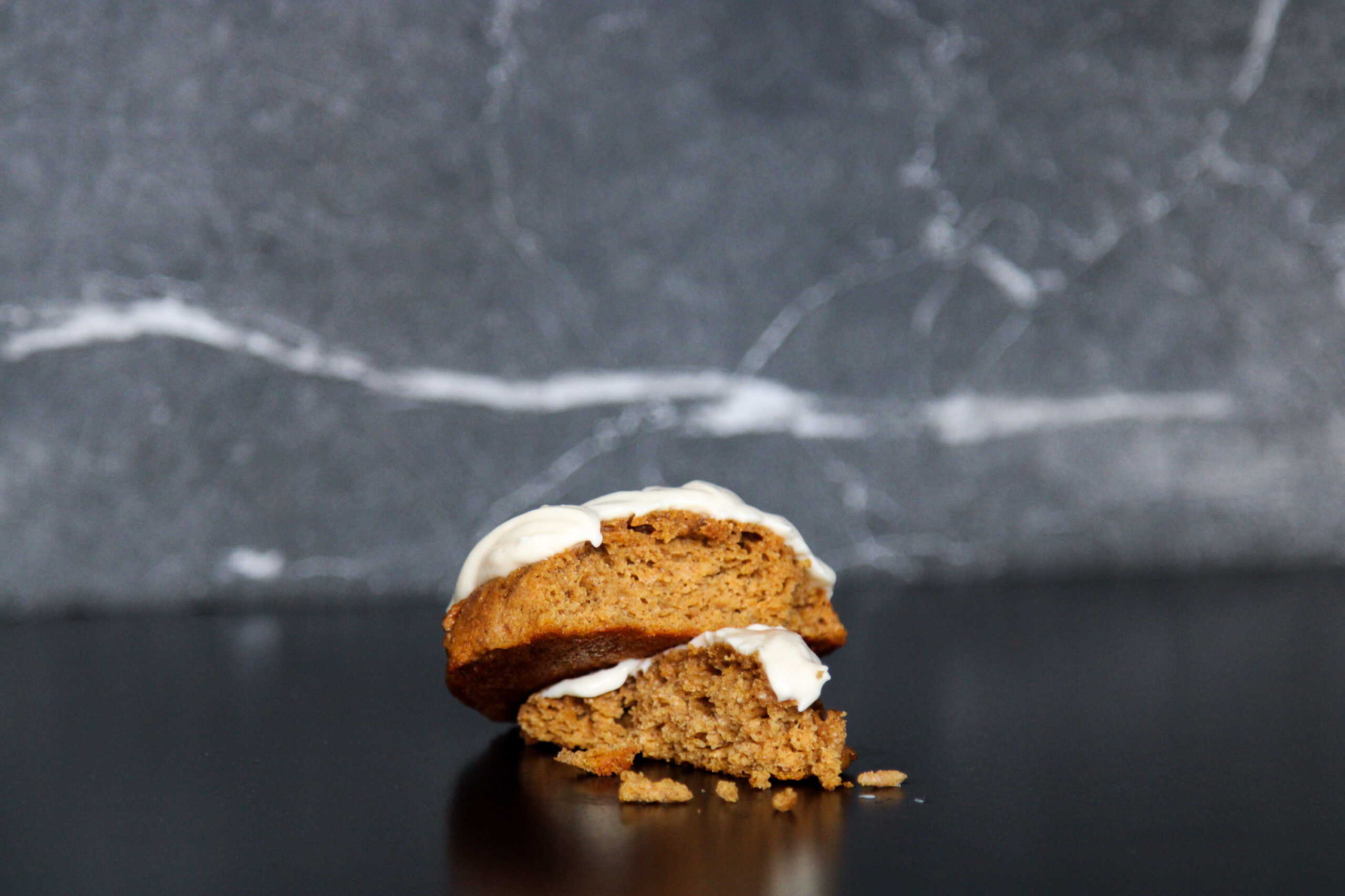 Pumpkin puree, Chickpeas, Oat flour, Protein Powder, Almond butter, Cinnamon, Greek yogurt, Pumpkin pie spice, Salt, Coconut sugar, baking powder, Low-fat cream cheese, Powdered sugar.
